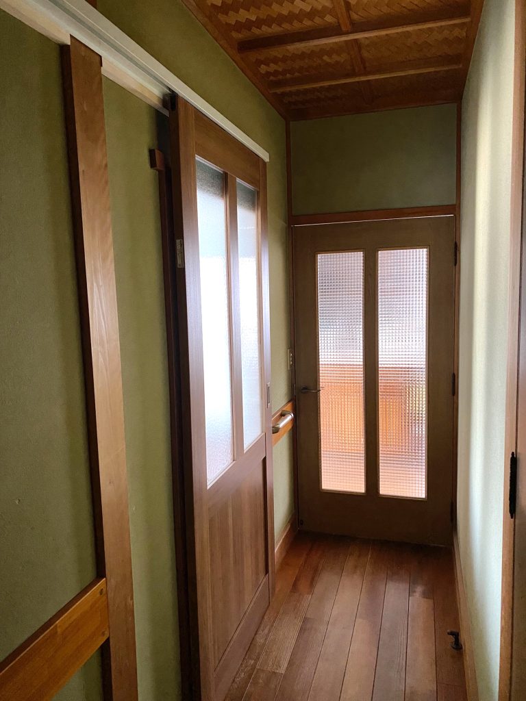 入口の開き戸だったため使いづらかったので、アウトセットタイプの引き戸に変更しました。
