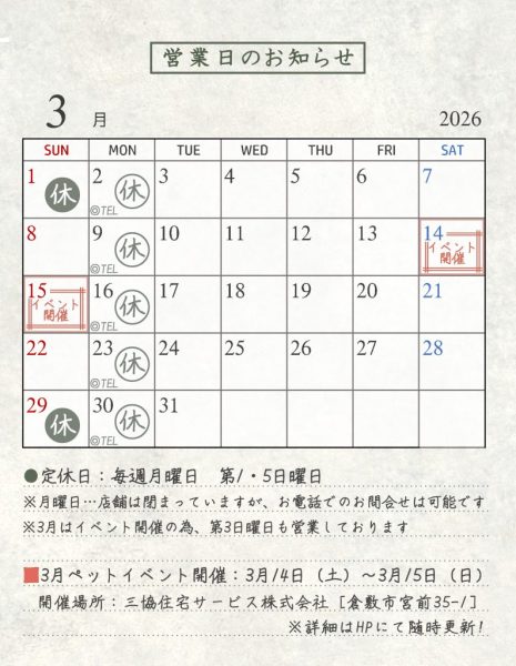 3月休業日のお知らせ